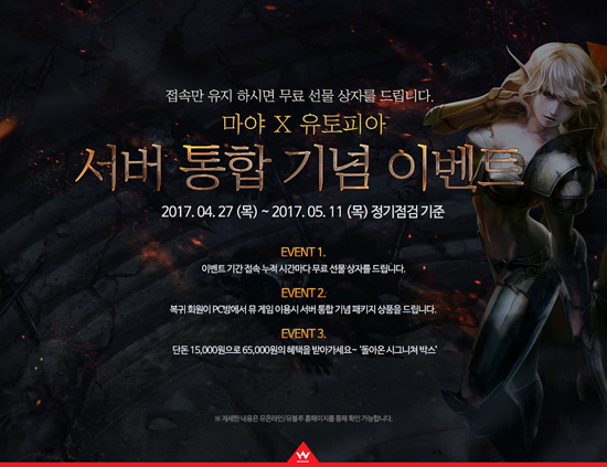 ...웹젠은 이벤트 기간 중 '뮤온라인'에 접속한 모든 회원들을 대상으로 게임아이템 1개를 랜덤으로 얻을 수 있는 선물 상자를 무료로 판매한다. 작은/보통/고급 등으로 구성된 세 종류의 선물 상자는 캐릭터의 특정 능력치를 높여주는 '상승의부적1' '분노의 스크롤' '스켈레톤 펫' 등의