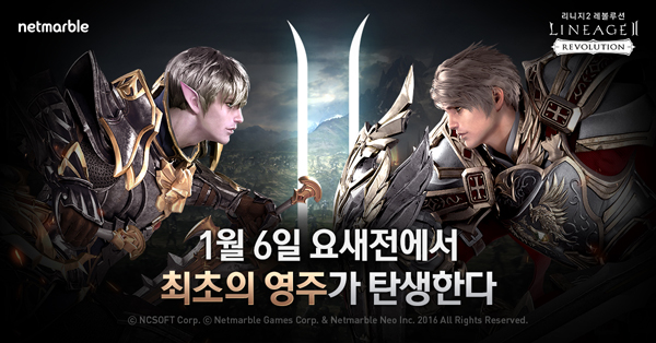 ... 레볼루션에서는 1월 6일 21시 30분부터 22시까지 30분간 영주를 정하기 위한 대규모 전투를 진행하며, 960개 승리혈맹과 최초의 영주가 탄생한다. 이날을 기점으로 넷마블은 매주 금요일 요새전을 열며, 참가만 해도 게임재화(아데나), 경험치, 피의증거 등을 증정한다. 승