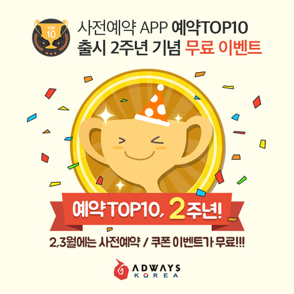... 이번 이벤트를 통해 국내외 모든 게임 개발사들은 누구나 예약TOP10에 무료로 게재가 가능하다. 무료 프로모션 기간은 2월부터 3월까지 두 달간 진행되며 참여 개발사는 최대 4주간 사전예약과 쿠폰 이벤트를 예약TOP10을 통해 진행할 수 있다. 이선진 애드웨이즈코리
