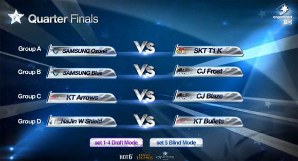 ... 추첨 결과 지난 시즌 결승 대진이었던 SK텔레콤T1 K와 삼성갤럭시 오존이 맞붙게 됐다. 또한 삼성갤럭시 블루와 CJ엔투스 프로스트, KT롤스터 애로우즈와 CJ엔투스 블레이즈, 나진 화이트실드와 KT롤스터 불리츠가 대결을 펼친다. 8강은 1~4세트가 드래프트 모드로 진행