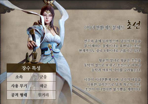 ... '일기당천' 여포는 방천화극을 주 무기로 적들을 베어넘긴다. 특히 여포는 패시브로 치명타 확률 증가와 치명타 시 생명력 회복을 보유하고, 액티브 스킬로 적을 끌어당긴 뒤 '무신의 분노'를 사용해 상대방을 제압한다. '절세미녀' 초선은 해금을 통해 원거리 공격을 펼친다