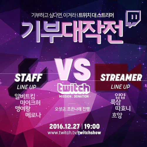 ... 모바일 게임, PC 게임, 콘솔 게임 등 맞대결에 용이한 다양한 장르를 선보일 예정이다. 뿐만 아니라 직접 몸을 움직여 맞붙는 '리얼 게임'도 준비되어 있어 모든 장르의 게임을 아우르게 될 것으로 보인다. 총 4라운드의 대결에서 승리한 팀은 1만 달러의 기부 금액의 기부자로