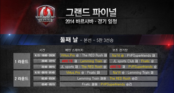 ... WGL은 플레이오프 본선 8강전 더블 엘리미네이션에서 The RED Rush: Unity와 Fnatic 차례로 격파한 Virtus. pro가 일찍부터 최종 승자전에 진출했고 이어서 PVP Super Friends와 Lemming Train를 격파한 Na’Vi 역시 최종 승자전에