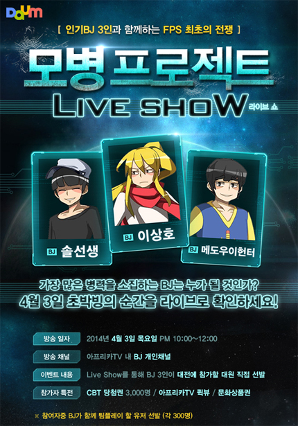 ... 라이브쇼를 시청하고 선택에 참여하는 사람에게는 문화상품권, 퀵뷰 등 다양한 경품도 주어진다. 이번 라이브쇼의 하이라이트는 라이브쇼가 마무리될 때쯤 획득한 페이스북 ‘좋아요’ 숫자에 따라 주어지는 벌칙에 있다. 가장 적은 ‘좋아요’를 획득한 BJ에게는 여장을 해야 하는 벌칙이