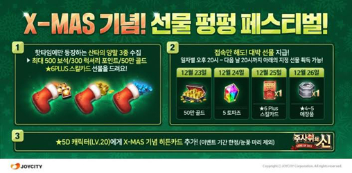 ... 모바일 ‘피망포커’와 ‘피망포커for Kakao’는 31일까지 게임에 접속하면 산타걸 이모티콘과 플라워리스 카드스킨 아이템을 자동으로 지급하는 이벤트를 진행한다. 아울러 오는 31일까지 실속 성탄절 박스와 고급 성탄절 박스 아이템을 한정 판매한다. 인기 웹툰 ‘마음의 소