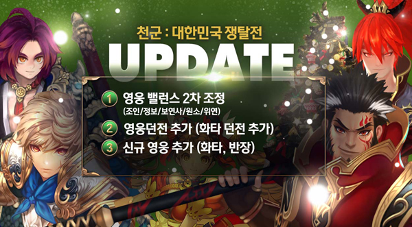 ... ‘반장’은 신규 이벤트 영웅 소환을 통해 획득할 수 있으며, ‘화타’는 신규 영웅 던전에서 만나볼 수 있다. 조인, 정보, 보연사, 원소, 위연 등 5종의 영웅에 대한 밸런스 조정도 이뤄진다. 여기에 신규 세트스킬 1종이 변경되고, 무한의 탑 콘텐츠에 ‘도전의 탑’이 추가