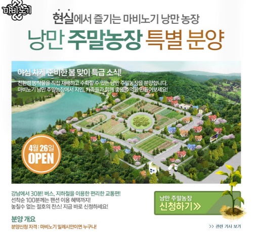 ... 또 회사 측은 주말농장 초보자들을 위해 친환경 재배법을 배우는 시간을 마련해주는 것은 물론 각종 작업도구 및 휴식공간도 준비했다고 설명했다. 특히 '강남에서 30분, 지하철을 이용한 편리한 교통편'이라는 카피를 넣어 이용자들의 마음을 들썩이게 했다. 이번 이벤트를