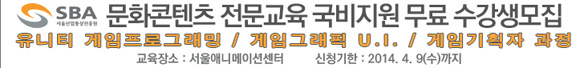 ... 이번 교육은 게임 프로그래밍, 그래픽, UI, 기획 등 4가지 과정으로 나뉘며 서울 남산에 소재한 SBA 애니메이션센터에서 수업이 진행된다. 강의는 실제 유니티엔진을 사용해 게임을 서비스해본 경험이 있는 개발자들로 구성된 유니티러닝센터 강사진이 맡는다. 또 4개월 간의 교