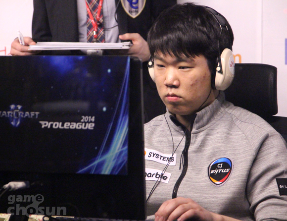 ... 정우용은 풍부한 광물 자원을 바탕으로 확장기지 없이 병영을 세개까지 늘리며 이른 타이밍의 힘싸움을 예고했다. 정우용은 화염차 한 기를 통해 정찰을 마친 뒤 화염차-해병에 건설로봇까지 대동해 박수호의 앞마당으로 향했다. 건설로봇까지 합세한 정우용의 병력은 단숨에 박수호의