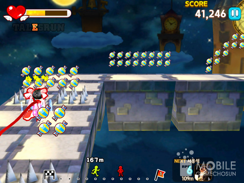 ... 동화 속 세상을 배경으로 각종 장애물을 피해 달리는 원작의 게임 방식에 횡과 종을 오가며 실시간 입체적으로 변하는 맵, 약 1만 3천종에 달하는 캐릭터 조합 등 모바일에 특화된 요소들을 3D 그래픽으로 담아냈다. 특히 온라인과 모바일 간 상호 연동이 가능하며 원작과 동일한 맵과