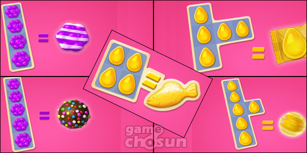 ...이들은 조합에 따라 5종류가 있고 각캔디의 효능도 각각 다르지만일거에 많은 수의 캔디를 부술 수 있다는 점은 동일하다. 특히 특수캔디 두 개를 합쳐 만드는 이중 조합은 일거에 화면 전체를 커버하는 경우도 있을 정도로 강력한 것이 특징이다. 결국 게이머는 이 조합을 얼마나 효과
