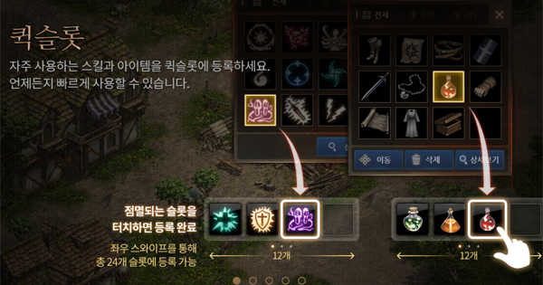 ... ◆ 자주 사용하는 스킬과 아이템은 퀵슬롯에 등록 ▲ 자주 사용하는 스킬과 아이템은 퀵슬롯 등록 효과적인 자동 사냥을 위해선 자주 사용하는 스킬과 아이템(소모품)을 퀵슬롯에 등록해야 한다. 퀵슬롯에 등록할 수 있는 스킬과 아이템 슬롯은 각각 12개이며 좌우