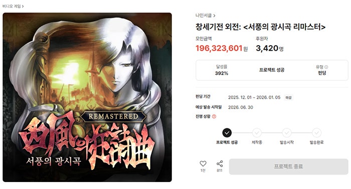1월 5일 종료된 창세기전 외전: 서풍의 광시곡 리마스터 펀딩은 후원자 3,420명, 모금액 약 2억 원으로 펀딩에 성공했습니다. 메르세데스에게 향하는 시라노 번스타인의 마음으로 다시 한번 창세기전을 만나려고 하는 게이머가 3천 명을 넘어선 것이죠. 아쉽게도 PC 외 플랫폼 출시 목표는 달성하지 못했지만, 메인스토리 풀 보이스 지원 달성엔 성공했습니다.