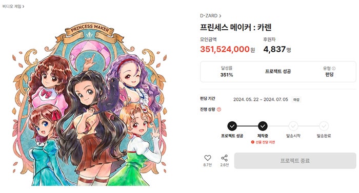 지난 2024년 7월 5일 펀딩에 성공한 프린세스 메이커: 예언의 아이들의 상황은 좋지 않습니다. 당초 개발사였던 디자드가 경영 악화로 문을 닫게되는 상황에 이르고, 산하 프로젝트였던 프린세스 메이커: 예언의 아이들의 개발 역시 미래가 불투명해졌죠. 이후 개발을 이끌던 손석호 PD가 펀딩 참여자들에게 사비로 환불하려던 소동이 있었고, 펀딩 홈페이지 공지는 서로 맞지 않는 등 혼란이 이어졌습니다.