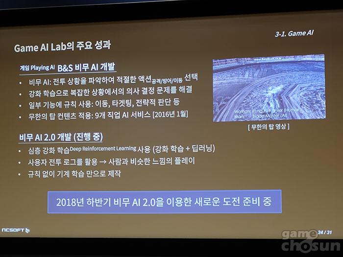 최근에는 기존 강화학습 기술에 딥러닝을 적용한 심층강화학습기술을 통해 AI의 성능을 개선하고 이용자들의 전투 로그를 활용하여 사람과 더욱 비슷한 느낌을 주는 AI를 개발하고 있다. 해당 기술은 올해 하반기 비무 AI 2.0을 통해 선보일 예정이다.