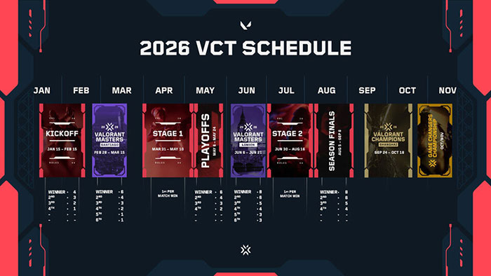 2026 시즌에는 킥오프 기간 중에 트리플 엘리미네이션 방식이 적용되며 2025 VCT 어센션을 통해 새롭게 승격한 팀들과 함께 각 권역(퍼시픽, 아메리카스, EMEA, CN)에서 총 48개 팀이 경쟁을 펼친다. 팬들과의 접점을 늘리기 위한 오프라인 로드쇼도 스테이지 2 기간 중 이어진다.