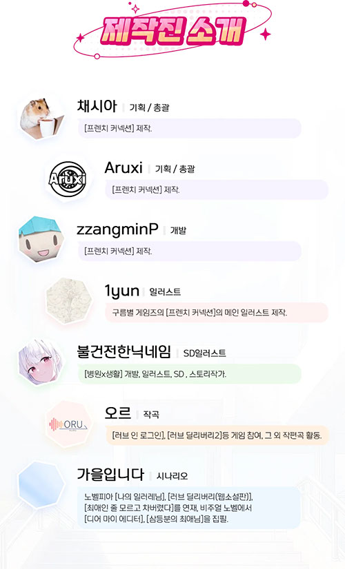 '나의 일러레님', '러브 딜리버리(웹소설판)', '최애인 줄 모르고 차버렸다', '디어 마이 에디터', '삼등분의 최애님' 등을 집필한 시나리오 라이터 '가을입니다' 작가 참여, '프렌치 커넥션'의 메인 일러스트를 담당한 '1yun' 일러스트레이터, '러브 인 로그인', '러브 딜리버리2' 등 게임 개발에 참여한 작곡가 '오르' 등 인기 작가들이 참여한 프로젝트다.