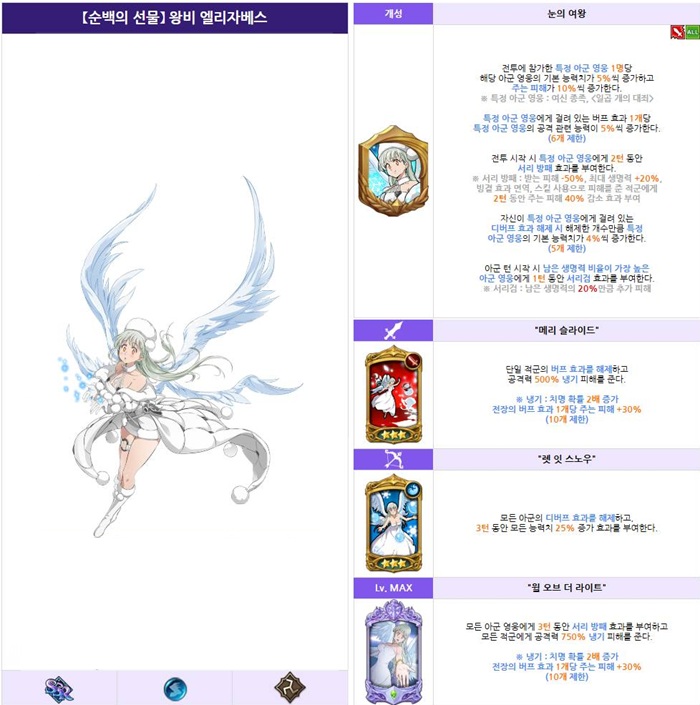 엘리자베스의 바리에이션인 만큼 여신 및 일곱 개의 대죄 특징을 가진 영웅과 조합했을 때 제성능을 발휘할 수 있으며, 아군에 걸려 있는 버프 개수에 따라 공격 능력이 증가하는 서포터 자원이다. 특히 순백 엘리자베스의 핵심 효과로는 서리 방패가 있는데, 받는 피해를 대폭 감소시키고 생명력을 증가시키면서 덱의 생존력을 끌어올린다.