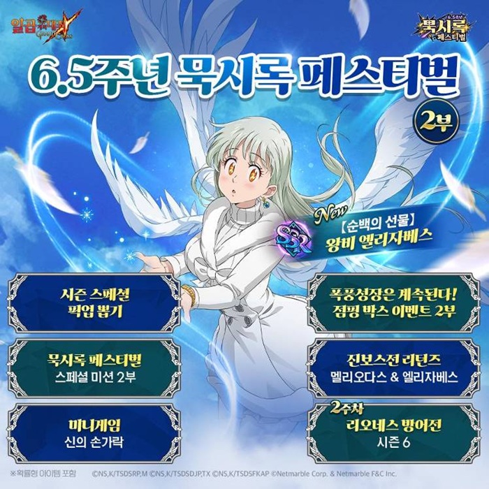 순백 엘리자베스는 6.5주년 시즌 스페셜 픽업 뽑기에서 획득 가능하며, 해당 스페셜 픽업의 라인업에는 발드르와 게르다, 젠나 등이 포함돼 있다.