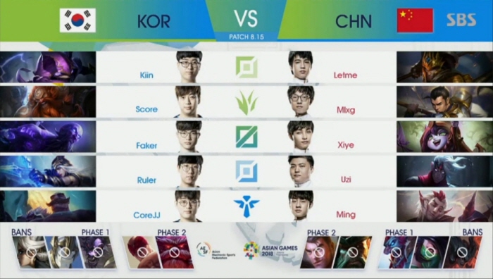 아시안게임 리그오브레전드 종목의 첫 우승자를 정할 첫 경기에서 한국 대표팀은 김기인(기인)-케넨, 고동빈(스코어)-그라가스, 이상혁(페이커)-라이즈, 박재혁(룰러)-애쉬, 조용인(코어장전)-브라움을 선택하고 카밀,갈리오, 알리스타, 리신, 오른을 벤픽했다.