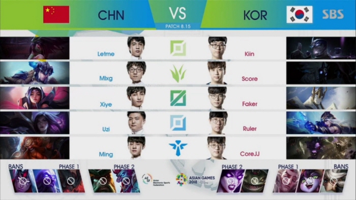 아시안게임 리그오브레전드 종목의 첫 우승자를 정할 두 번째 경기에서 한국 대표팀은 김기인(기인)-쉔, 고동빈(스코어)-킨드레드, 이상혁(페이커)-갈리오, 박재혁(룰러)-애쉬, 조용인(코어장전)-알리스타를 선택하고 카밀, 룰루, 라칸, 모르가나, 탐켄치를 벤픽했다. 전 경기에서 중국 대표팀 딜러진이 크게 활약할 수 있도록 시너지를 낸 챔피언 룰루와 라칸을 벤픽하며 2경기를 꼭 승리하겠다는 각오가 비쳤다.