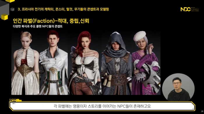 또 사실적인 표현에 있어서 커스터마이징 되는 얼굴과 헤어, 복식의 퀄리티를 높이는 데 집중했다. 게임 내 등장하는 대륙이 큰 만큼 다양한 지역과 그 안에서 살아가고 있는 NPC, 재미있는 콘셉트를 확인할 수 있도록 제작중이다. 덕분에 게임을 플레이하면서 각각의 파벌들과 적대, 중립, 신뢰 등의 관계를 맺으며 다양한 콘텐츠를 경험 가능하다.