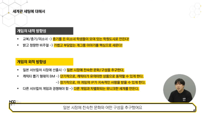 게임의 외적 방향성은 일본에 선출시 해야하는 상황, 캐릭터 뽑기 형태의 BM, 다른 서브컬처 게임과 경쟁을 고려해야 했다. 이에 모든 캐릭터의 이름을 일본식으로 짓고, 적으로 등장하는 캐릭터조차 사랑받을 수 있는 형태가 되었다. 마지막으로 다른 서브컬처 게임과 경쟁하기 위한 요소, 블루 아카이브만의 유니크한 설정을 위해 고민했다.