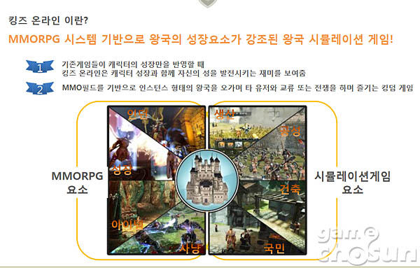 이은준 이사는 “킹즈온라인은 쉽게 설명하면 MMORPG 시스템을 기반으로 왕국의 성장요소가 강조된 게임이다” 라며 “유저는 왕 캐릭터를 일반 MMORPG처럼 사냥터와 던전을 통해 육성할 수 있다. 또 인스턴스 지역에서 성을 건설해 자원을 생산하고 국민을 다스리며 성을 확장해 공성전을 치르는 재미도 있다”고 게임을 소개했다.