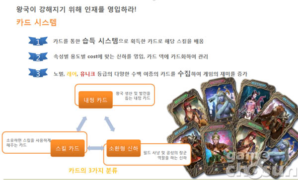 스킬 카드를 통해 해당 스킬을 배울 수 있으며 내정 카드는 왕국의 생산과 발전을 돕는 데 사용된다. 소환형 신화 카드는 필드 사냥과 공성의 장군 역할을 한다.