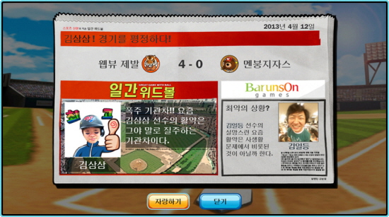 기존 야구매니지먼트게임의 틀을 벗어나 새로운 시도를 했다는 것만으로도 충분히 가치가 있는 게임이다. 함께 즐기는 친구가 많으면 많을수록 배가 되는 게임의 기획도 독창적이다.