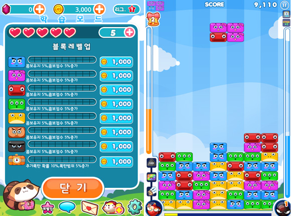 또한 ‘레벨업’ 기능을 통해 각 블록 마다 골드를 소모해 콤보 유지 시간과 점수를 상승 시켜 고득점을 노릴 수 있다. 이외에도 1배속부터 4배속까지 블럭의 감도를 조절지원해 화면 크기에 따라 감도를 설정해 게임을 좀 더 세심하게 풀어나갈수도 있다.
