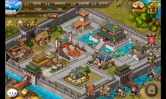 영지 내 다양한 건물을 업그레이드해 장수와 부대를 강화시킬 수 있고 매 4일마다 국가전을 진행해 각 서버에서 최고 길드를 결정한다. 이외에도 국앙전, 군단전, 은광전 등 다양한 대규모 PVP 콘텐츠가 포함됐다.