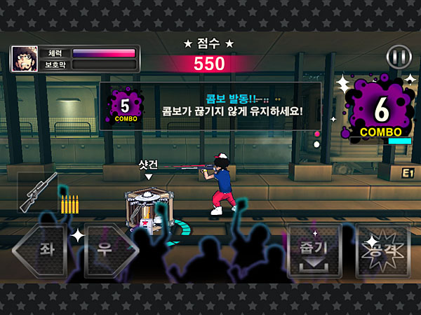기본적인 전투는 화면 좌우에서 좀비가 끊임없이 등장하며 시작된다. 게임 초반에는 배경음악에 맞춰 그루브를 타며 여유롭게 상대할 수 있지만 후반부로 갈수록 벅찰 만큼 쏟아진다.
