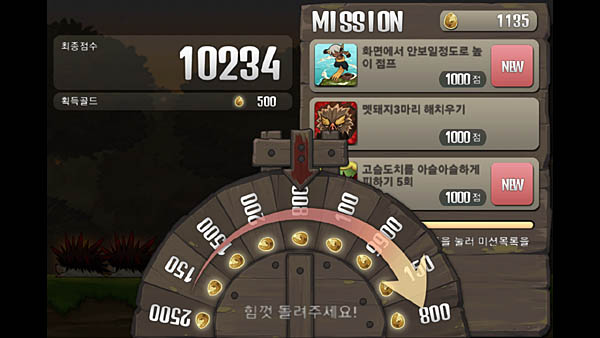 게임을 한 판 플레이 했을 때 게이머가 얻는 보상은 게임머니에서 끝나지 않는다. 특정 임무를 완료하는 미션이 기본 3개가 제공되고 이를 완료하면 추가 점수 외에도 미션 게이지를 채운 뒤 룰렛을 돌려 추가 게임머니를 획득할 수 있고 점수에 따라 캐릭터는 경험치를 얻고 레벨업을 해 골드와 ‘하트’에 해당하는 과일을 얻는다.