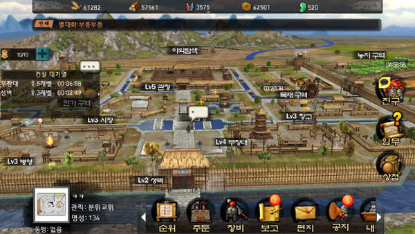 먼저 마을의 경우 관청과 병영, 시장, 무장대, 성벽, 관청, 창고, 농지, 민가, 목재 등 세분화된 지역이 존재하며 해당 지역의 레벨이 높을 수록 효율적으로 자원을 확보하거나 더 좋은 병력을 생산할 수 있다. 건물 레벨의 경우 일정한 자원과 시간이 필요하다.