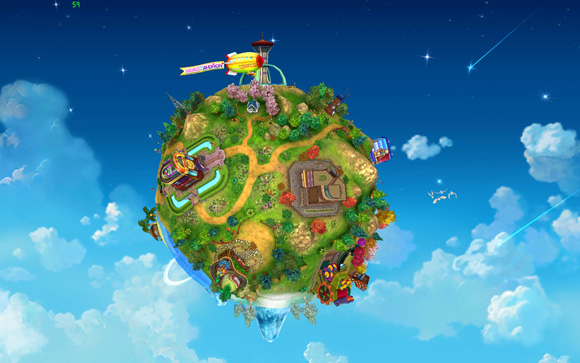 위아의 첫 게임 시작 장소는 전체 세계를 상징하고 있는 ‘위아 별’에서 시작된다. 이 화면을 살펴보면 중앙에 ‘위아별’이 위치해 있고 별의 상단 부분에 주요 콘텐츠들과 시스템들이 아기자기한 건물로 표현돼 있음을 확인할 수 있다.