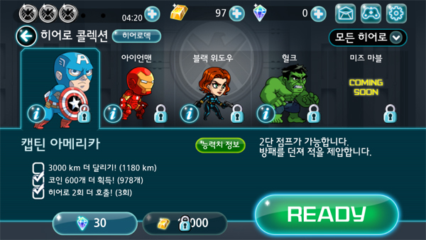 물론 영웅 상점을 통해서는 헐크, 아이언맨, 어벤저스 등 마블의 대표적 영웅이 다수 존재하고 그들은 크게 ‘뛰는 형-나는 형- 때리는 형’ 등 3가지의 각기 다른 능력을 가지고 있다.