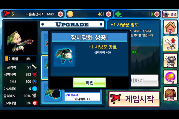 콘트롤이 부족한 유저를 위해 장비교체, 강화, 보석 장착 시스템이 준비돼 있다. 장비를 교체하고 강화할수록 공격력, 성벽 체력 등이 상승해 더욱 쉽게 클리어할 수 있게 해준다.