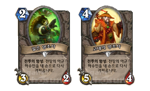 여기에 영웅 카드인 '나 이런 사냥꾼이야'를 들고 있다면 더 이상의 카드 추가는 승리를 위한 덤일 뿐이다. 해당 카드는 공격력 7 이상인 하수인을 처치하는 '전투의 함성'을 갖고 있어 적 하수인을 처치하는데 유용하다. 이 카드의 효력을 극대화할 수 있는 카드로는 젊은 양주사와 고대의 양조사로 이들은 자신의 하수인을 회수하는 효과를 가지고 있어 전투의 함성을 두 번 사용할 수 있다.