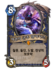 질풍, 돌진, 도발, 천상의 보호막. 하스스톤 카드에 부여할 수 있는 모든 옵션이 붙어 있는 전설 카드가 존재한다. 주술사 전용 전설인 바람의 군주 알아키르가 그 주인공이다.