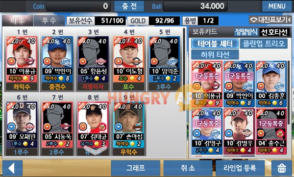 야구룰도 KBO의 룰 을 그대로 사용하여 포지션, 선호타선, 승률 등도 실제 경기와 같은 방식으로 진행됩니다. 다만 실제 경기처럼 하루에 한게임만 진행하는 것이 아닌 매시간 자동으로 경기가 진행되며 경기결과에 따라 선수들을 조정해주면 됩니다. 그리고 매일매일 1씩 늘어나는 골드(선수코스트)에 맞혀 전략적으로 선수카드를 구성할 수 있습니다.