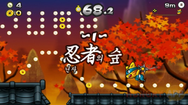 <고공닌자>는 굳이 말하자면 <쿠키런>의 형태와 비슷하다. 체력 게이지 대신 시간이 있고 게임이 진행되면서 시간이 소모된다. 장애물에 부딪히거나 아래로 떨어지면 시간 게이지가 깎인다. 다만 체력을 시간으로 표현한 것에서 새로운 시도가 엿보인다.