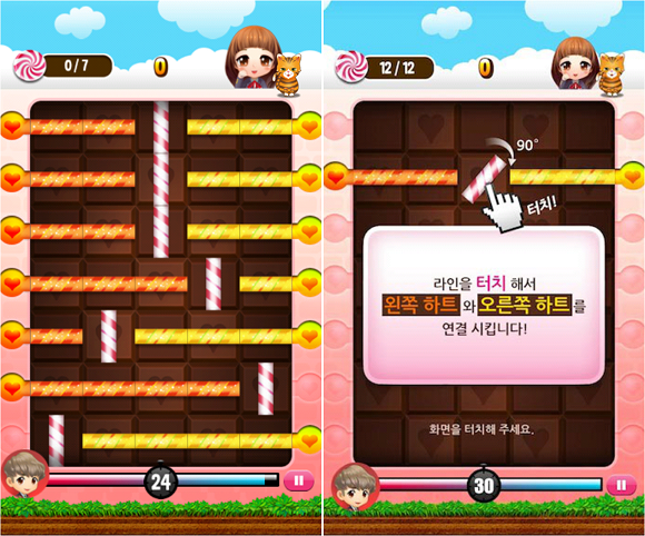 게임 방식은 아~~주 간단하다. 한번의 터치를 통해 스테이지 별 주어진 찬스 수 만큼의 캔디(막대기)를 돌려 양끝의 하트를 서로 연결하고 제거하면 된다.