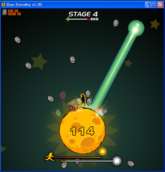 그렇다고 무적장 피하기만 해서 점수를 높게 받는 것은 아니다. 눈에 보이는 운석 외에 행성 표면의 빨간 표시등이 완성되기 전에 지나치면 얻는 용기점수를 더 얻을 수 있고, 무적 아이템인 왕관을 적절한 타이밍에 활용해야 생명 시간을 늘릴 수 있다.