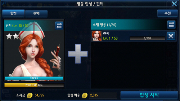 퀘스트 및 전투 보상으로 영웅 티켓을 획득할 수 있으며, 보유한 용병을 합성 또는 진화시키며 더 강한 캐릭터로 육성할 수 있다.