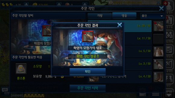 장비에 특수 능력치를 부여하는 주문 각인, 높은 레벨의 장비도 사용할 수 있도록 요구 레벨을 낮추는 장비 개량 등의 시스템을 활용해 더욱 강한 장비를 만들 수 있다.