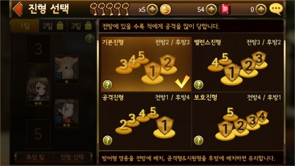 결투장에 입장하기 위해서는 최소 1명, 최대 5명의 영웅을 팀에 배치해야 한다. 입장하자마자 눈에 띄는 것은 우측의 ‘진형 선택’ 부분이다. 결투장에서는 진형에 따라 공격력과 방어력에 상승 효과가 달라서 전략적으로 선택해 결투장에 입장해야 한다.