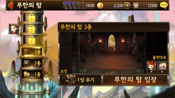 또 하나의 전투 콘텐츠인 무한의 탑에서는 모험을 통해 가지기 힘든 아이템이나 영웅, 많은 골드를 얻을 수 있다. 모험만으로는 성장이 힘들다 싶을 때에는 무한의 탑에서 장비를 맞춘 뒤 모험을 떠나면 된다.