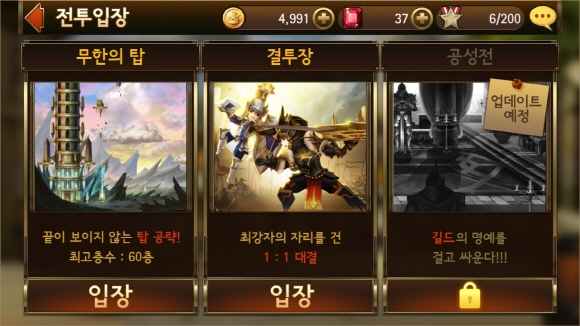 ‘세븐나이츠’에서 아쉽게도 아직은 즐길 수 없는 콘텐츠가 있다. ‘결투장’ 옆에 있는 ‘공성전’이 바로 그것이다. 업데이트 예정이라고 돼있는 만큼 조만간 선보일 것으로 예상된다.