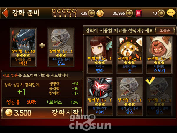 강화는 4성을 기준으로 같은 4성을 재료로 사용하면 성공확률은 100%, 3성이면 50%, 2성이면 25%, 1성이면 10%의 확률이다. 게임머니인 골드를 소모해 +5성 진화를 위해서는 많은 골드가 필요하다.